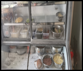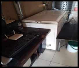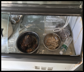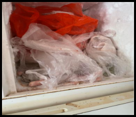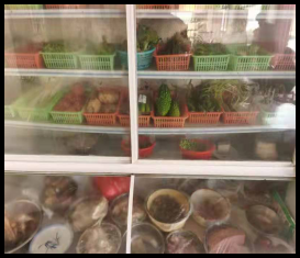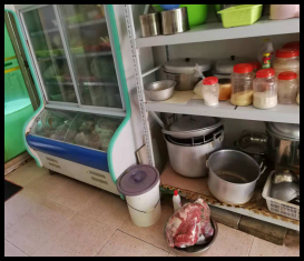 4、儲(chǔ)藏區(qū)物品雜亂,柜內(nèi)肉食裸露存放,衛(wèi)生條件差。