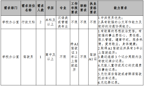 為適應學校發(fā)展的需要,需面向社會誠聘2名行政人員及1名駕駛員,現將有關事項公告如下: