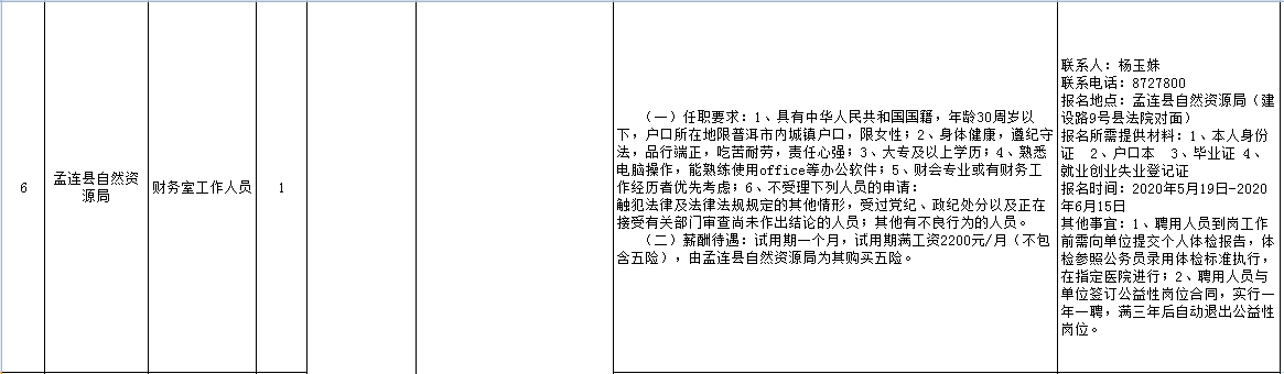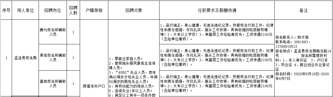 根據(jù)《普洱市人力資源和社會保障局 普洱市財(cái)政局轉(zhuǎn)發(fā)云南省人力資源和社會保障廳 云南省財(cái)政廳關(guān)于進(jìn)一步做好公益性崗位開發(fā)管理有關(guān)工作的通知》(普人社發(fā)〔2020〕35號)精神,本著“公開、公平、公正”的原則,現(xiàn)將2020年第一批孟連縣城鎮(zhèn)公益性崗位招聘簡章公告如下,公告時間:2020年5月19日-2020年6月2日。